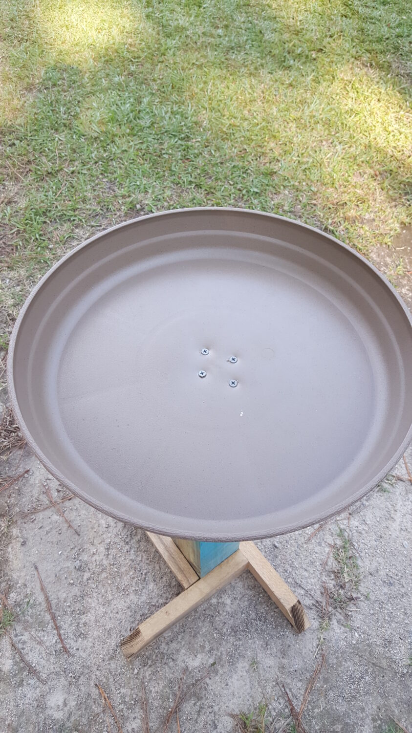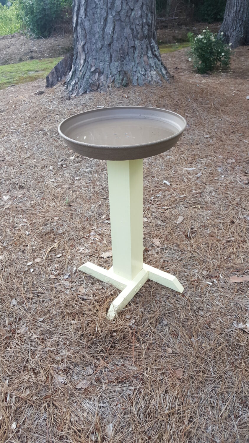 This DIY bird bath cost me nothing–not one penny. We used up scrap wood and a plant saucer that I found in storage. But the birds don’t care very much about the cost–they really seem to enjoy splashing down and cooling off during the hottest parts of the day.