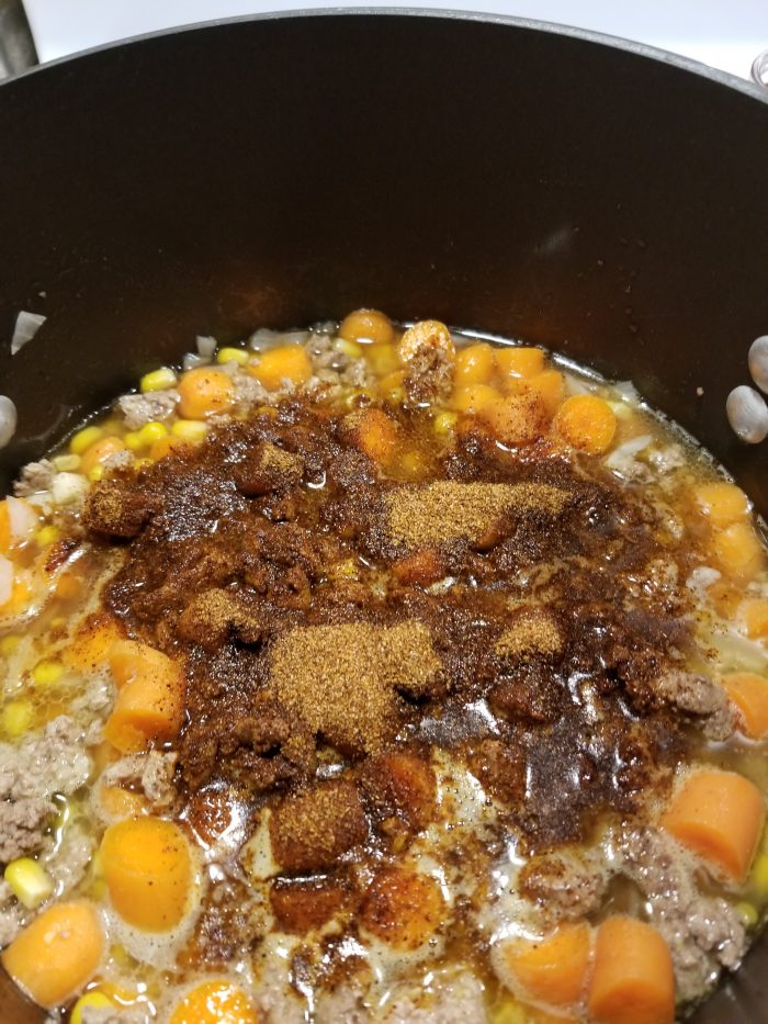 - Drop the cut veggies, the can of corn, the can of chicken stock into a chili pot.