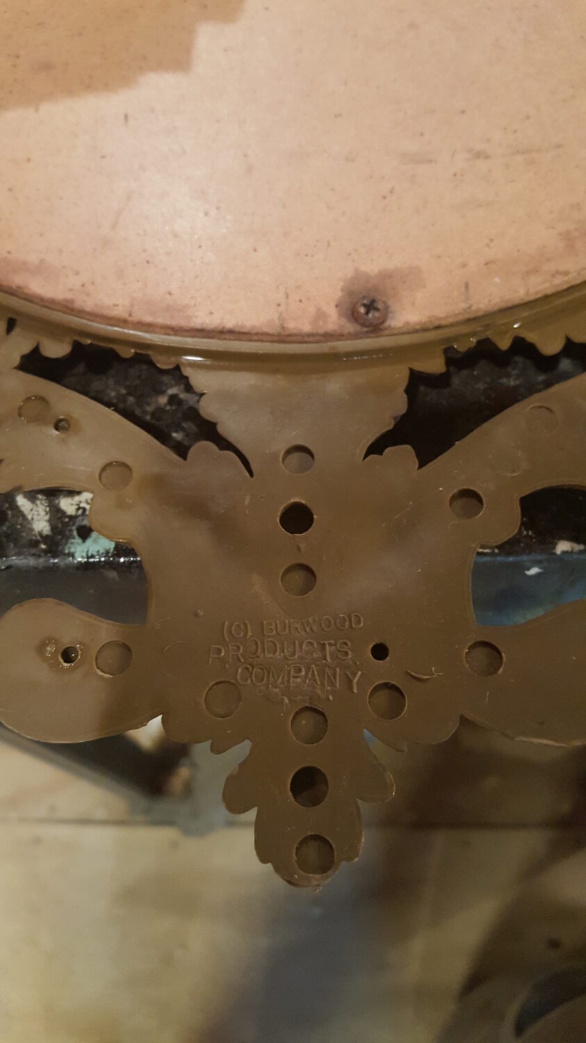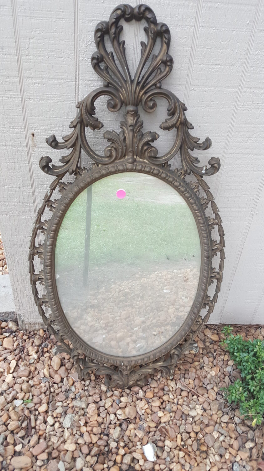 As I took it apart, I found the manufacturer’s information. It was stamped: Burwood Products Company on the back of the frame. The back of the mirror was stamped with the date Jan 15 73. It turns out, these pieces are collectible. However, with some humidity damage and scratches, I decided to paint it to my liking and keep it.