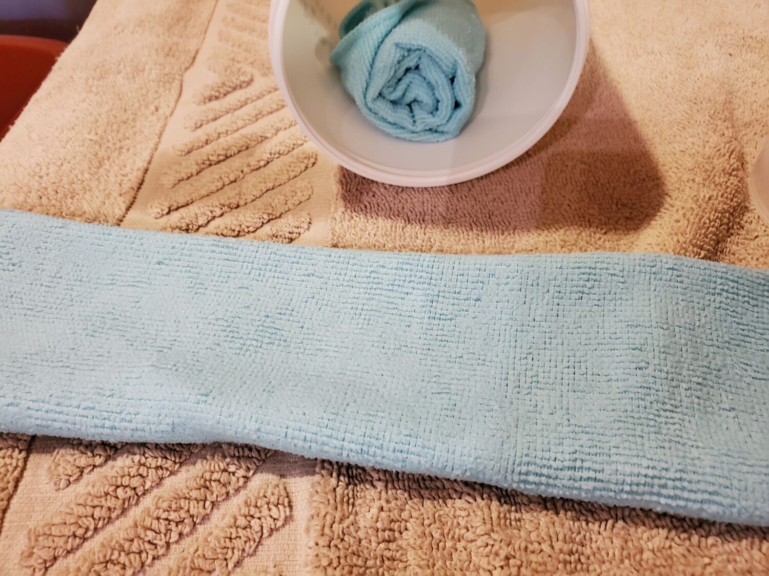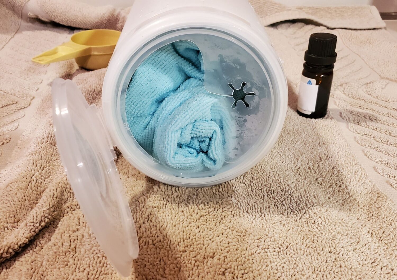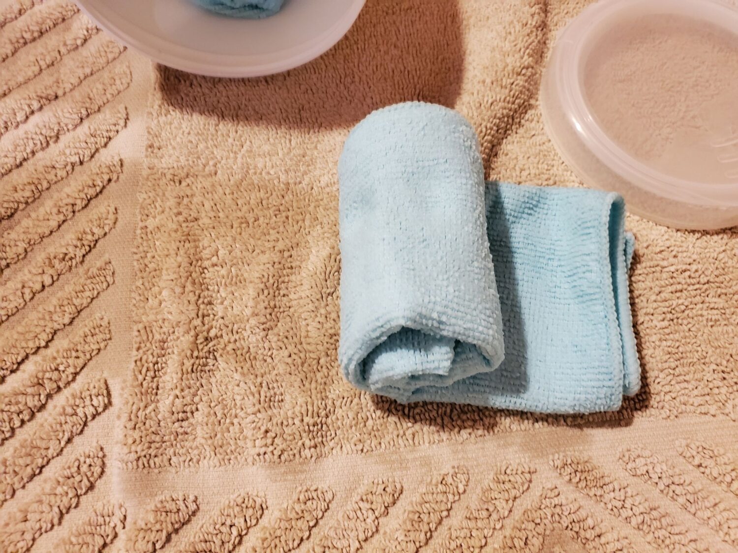 - Working on the towel you laid down, lay each microfiber flat, folding over twice to make a long, narrow strip. Roll it up and put it into the empty wipe container – repeat for all ten.
