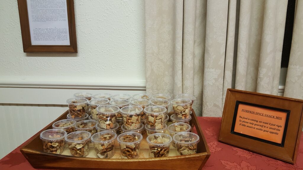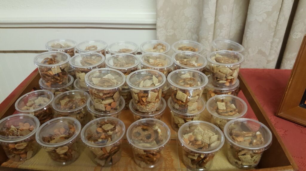 He rented the social room of their church. I was going to be in the separate kitchen area getting the caterers settled and knew I wouldn’t be able to greet guests as they arrived. So I made a big batch of this snack mix, placed them in individual cups with lids, and set them out on a table with a little poem. It invited them to grab a snack to munch on while they were waiting for the guest of honor.